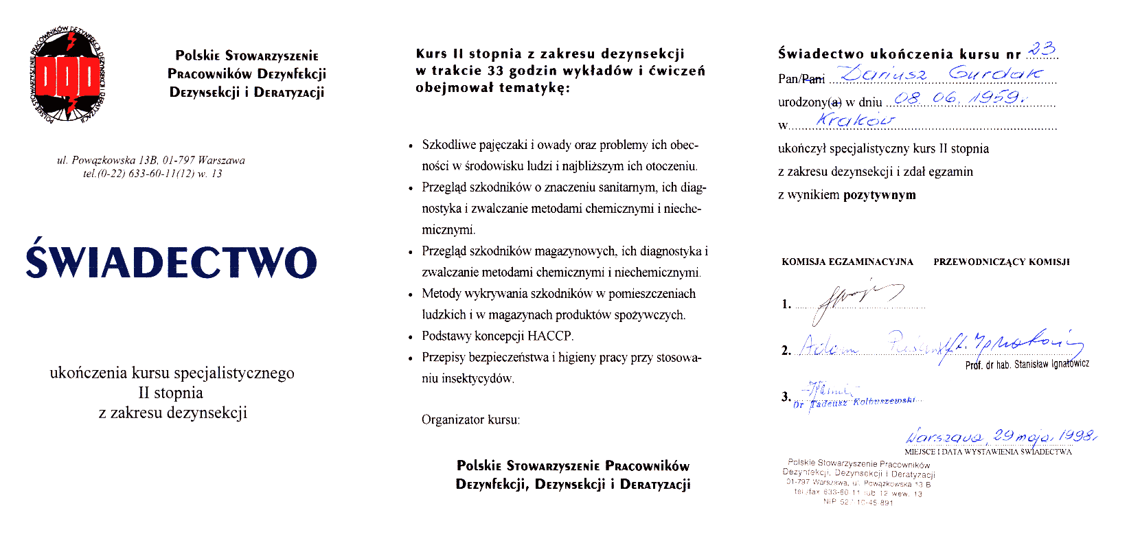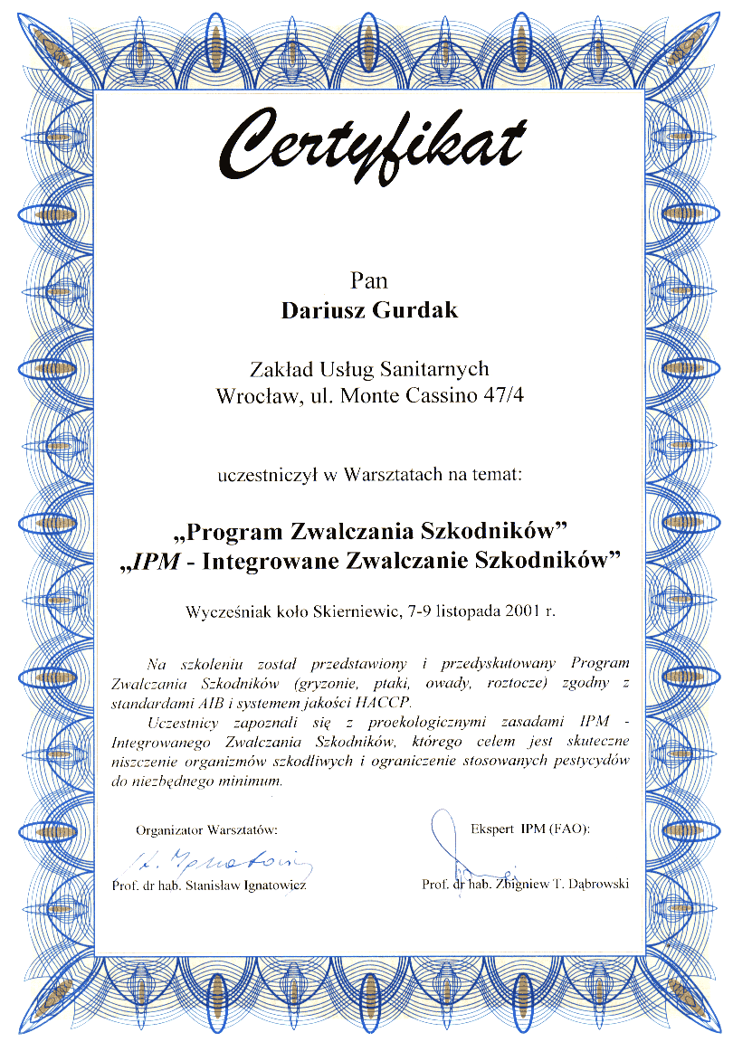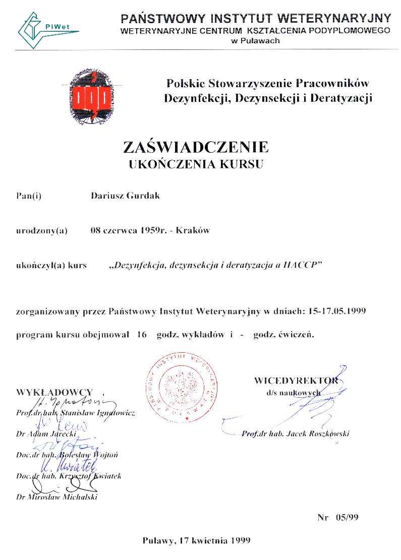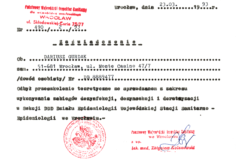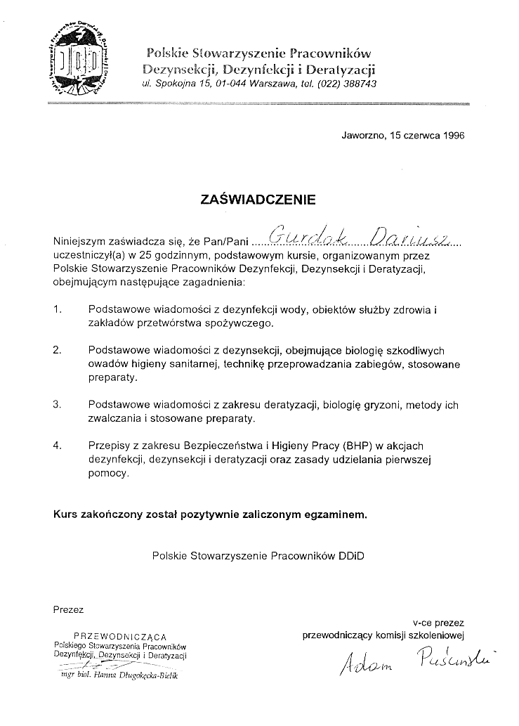 | Świadectwo ukończenia kursu specjalistycznego II stopnia z zakresu dezynsekcji |
