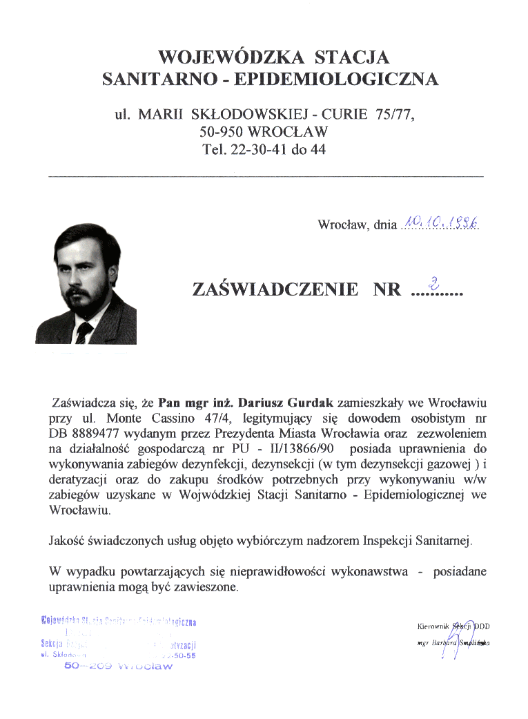 Zaświadczenie posiadania uprawnień do wykonywania zabiegów DDD |