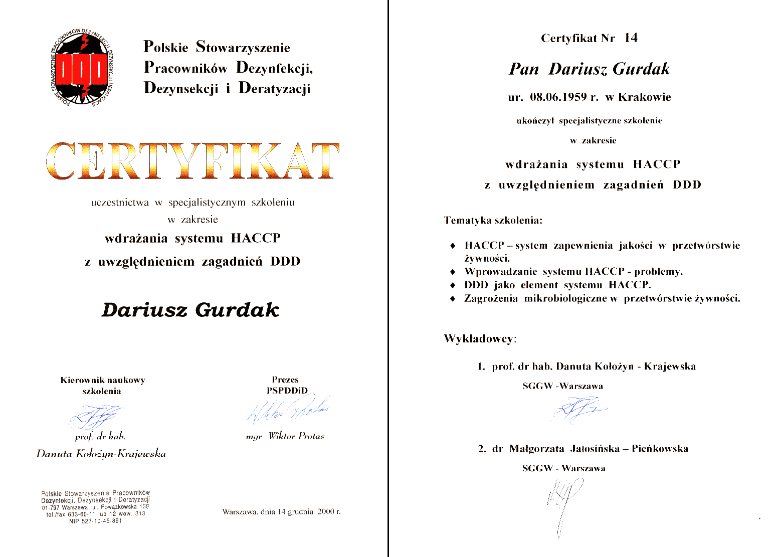 Zaświadczenie ukończenia kursu "Dezynfekcja, dezynsekcja i deratyzacja a HACCP" |