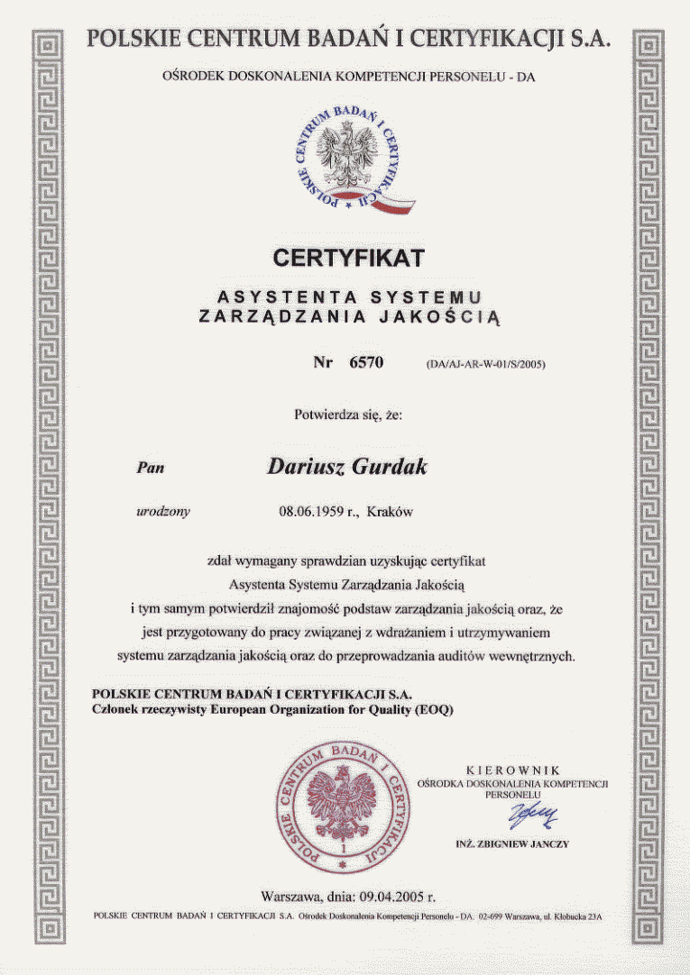 Certyfikat Asystenta Systemu Zarządzania Jakością |