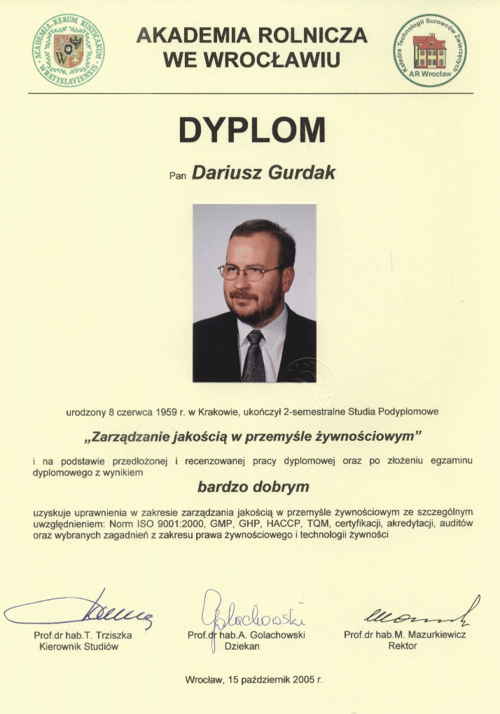 Dyplom ukończenia studiów podyplomowych "Zarządzanie jakością w przemyśle żywnościowym" |
