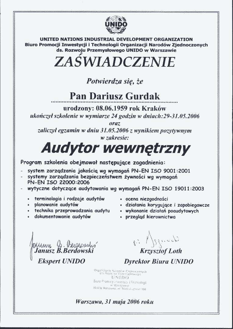 Zaświadczenie zdobycia kwalifikacji Audytora wewnętrznego |
